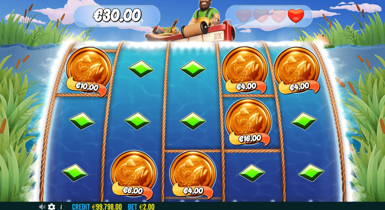 The game’s bonus rounds are a highlight. The Collection feature returns in the Free Spins round, activated by landing three or more Scatter symbols. Players receive 10 spins, and any Wild Fisherman symbol landing with a Fish symbol collects its value. Wilds are stored in a meter, increasing the global multiplier and granting additional spins as more are collected.