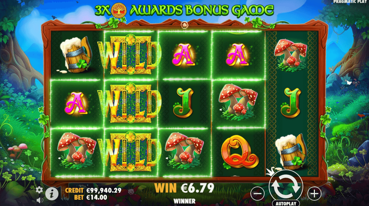 The game’s soundtrack is characterized by folksy guitar strumming, accompanied by bird calls to enhance the natural setting. Players can expect to see symbols such as wooden mugs of beer, magical toadstools, golden Celtic trees of life, and jeweled green shamrocks. A friendly leprechaun and a red-haired girl with a playful smile also appear among the symbols.