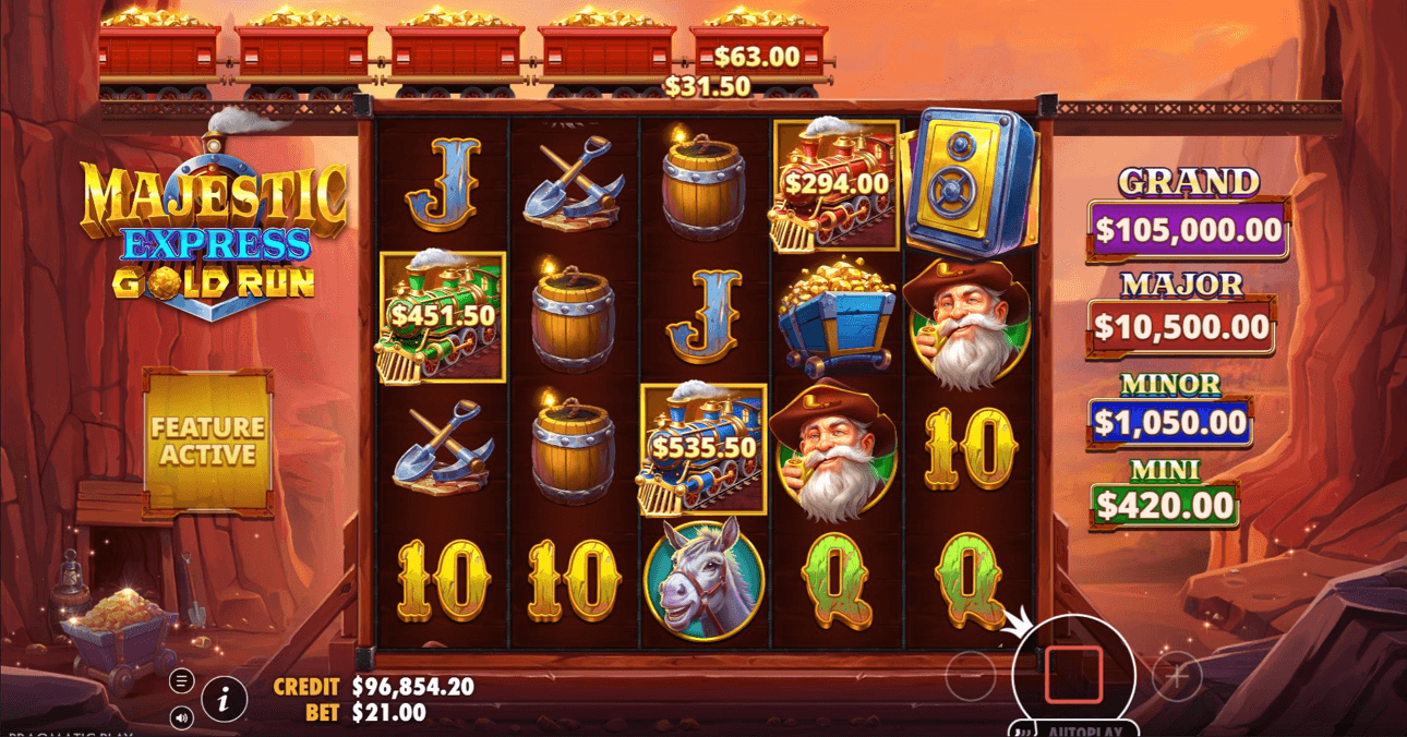 Majestic Express: Gold Run, a slot by Pragmatic Play, offers a fresh take on the mining theme. Set against the backdrop of a majestic canyon, the game features a golden train traversing the top of the grid, with gold dust adding to the atmosphere. The soundtrack complements the visuals with an upbeat, country-inspired tune, enhancing the mining adventure in the American wilderness.