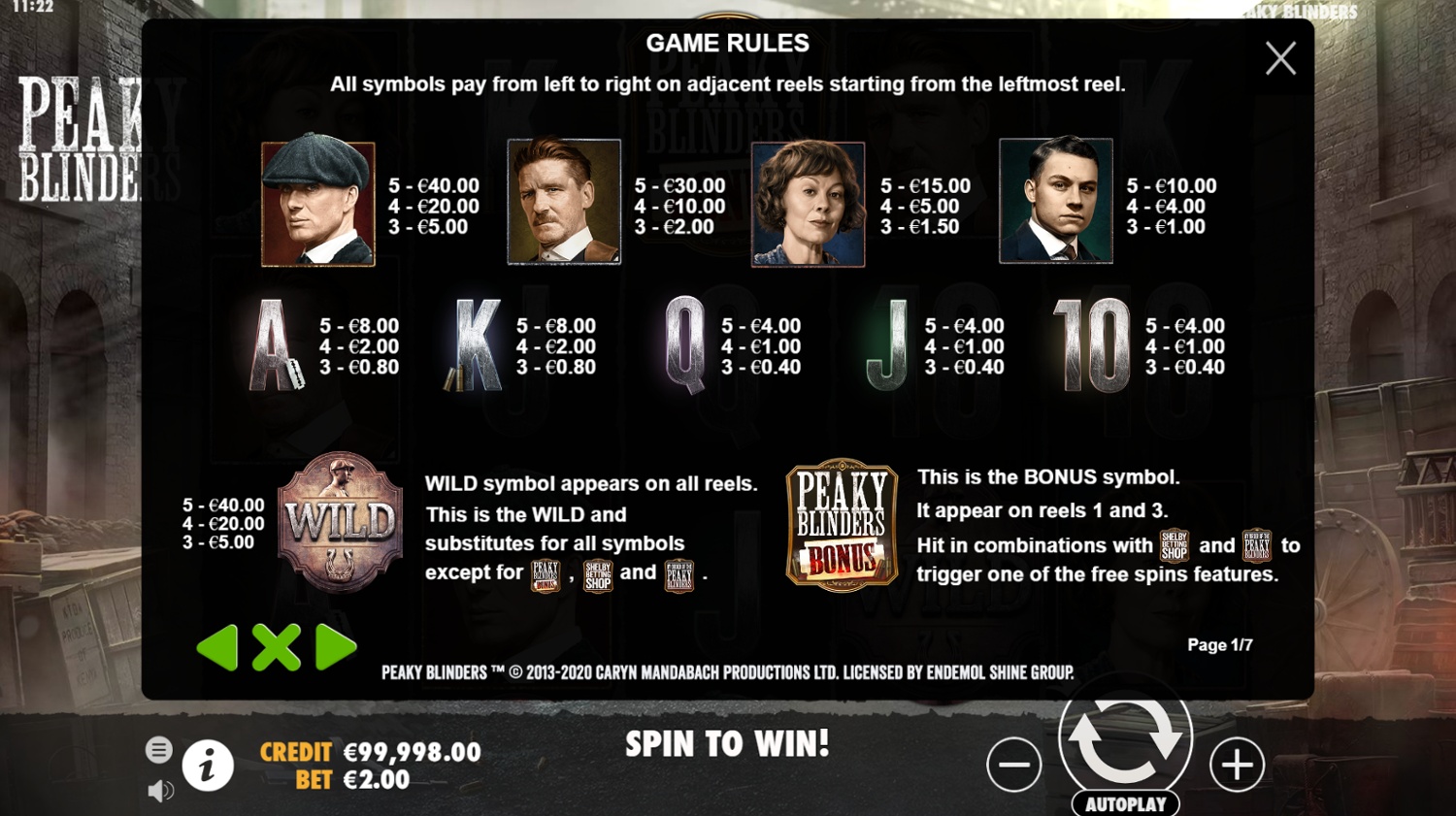 - The Wild symbol substitutes for all symbols except the Bonus, Shelby Betting Shop, and By Order of the Peaky Blinders symbols.