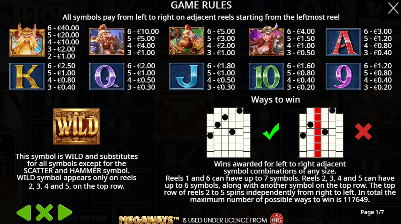 Power of Thor Megaways features a 6-reel grid with a horizontal top reel, employing the popular Megaways mechanic. The number of symbols on each reel varies randomly between 2 and 7, creating dynamic gameplay with each spin. With an RTP of 96.55%, this slot sits comfortably above the industry average, offering fair returns to players over extended sessions.