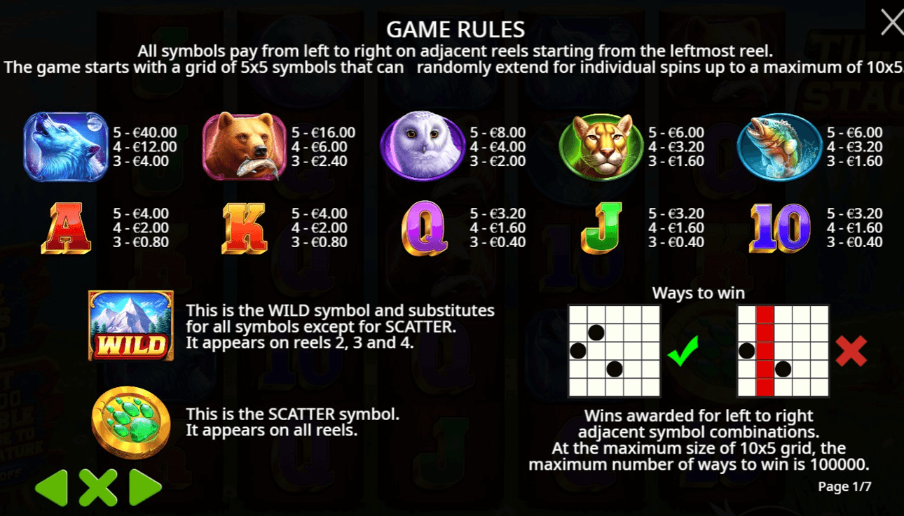 Timber Stacks takes players on a journey through the American wilderness, immersing them in a lush evergreen forest. Along this journey, players encounter various wild animals such as owls, wolves, and mountain lions.